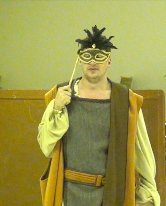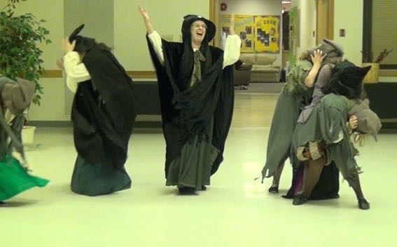 Opening torch dance, the Ballo Fatto, Sydney Cochrane (left) and Taylor Saunders (right) from Shakespeare in Action, a devised script featuring monologues from many Shakespeare plays, storytelling, poetry, music and dance, directed by Antony Stamboulieh and costumed by Kathy Osterhagen. Below, (left) Hecate, played by Christine Lawrence, and the witches from Macbeth plot Macbeth’s demise before breaking into a wild dance. (right) Benedict from Much Ado About Nothing played by James Ingram as he disguises himself to learn what Beatrice thinks of him—he is not happy with what he hears!